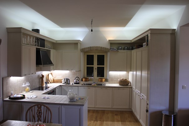 Diskretna LED rasvjeta s kojim vršimo osvjetljenje donjih ili srednje visokih dijelova kuhinjskog prostora pružit će utisak spajanja modernog i ekskluzivnog, a isto tako doprinijeti uklapanju kuhinje u ostatak stambenog prostora.